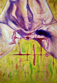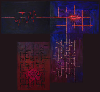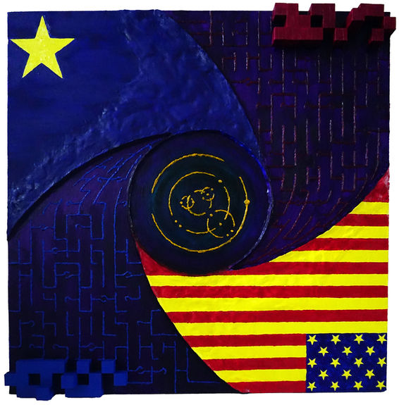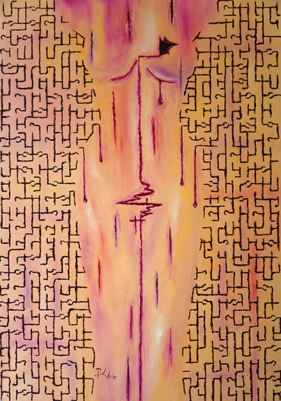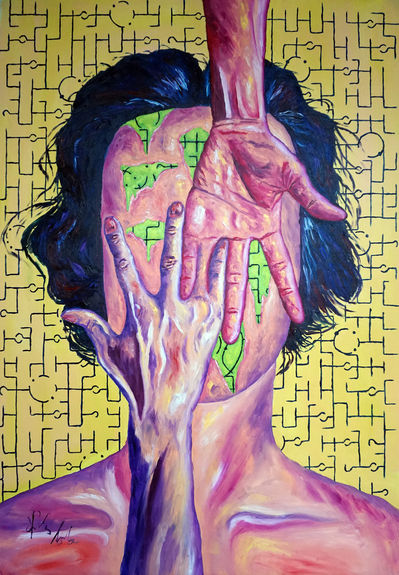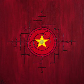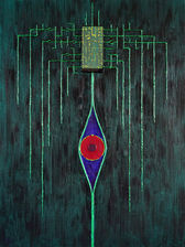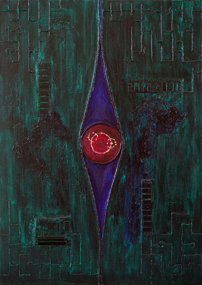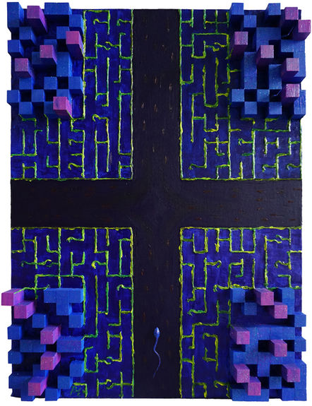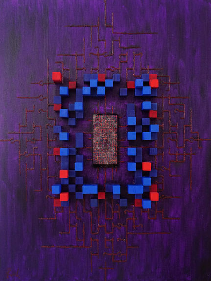 在我的作品中,总能看到密码的存在,而密码背后,则是被隐藏的信息。至今为止我已经通过数学的形式创造了过十套密码系统并将其融入到我的作品中,有时候一幅画里有一个密码系统,有时候则多个密码叠加在一起。每套密码的形状各不相同(有的是线条,有的是几何体,有的是圆的变形,有的是类似于文字的符号或立体方块组合等),因为在不同的画作中,我会根据画的主题而有所选取,而正是因为这些密码的不同形式使其具有对画面不一样的象征意义。因为这些密码都是通过数学处理形成的,而数学是当今一切科技进步的基础,因而在一定程度上,这些密码在画面中的呈现代表了科技与数据。密码构造的逻辑性则使其象征着一种秩序与规律。而密码本身又是一种隐藏的方式,因而有时又象征某种秘密或不被公众接受的思想或虚拟世界的映像等。具体可以参考我的密码主义宣言。